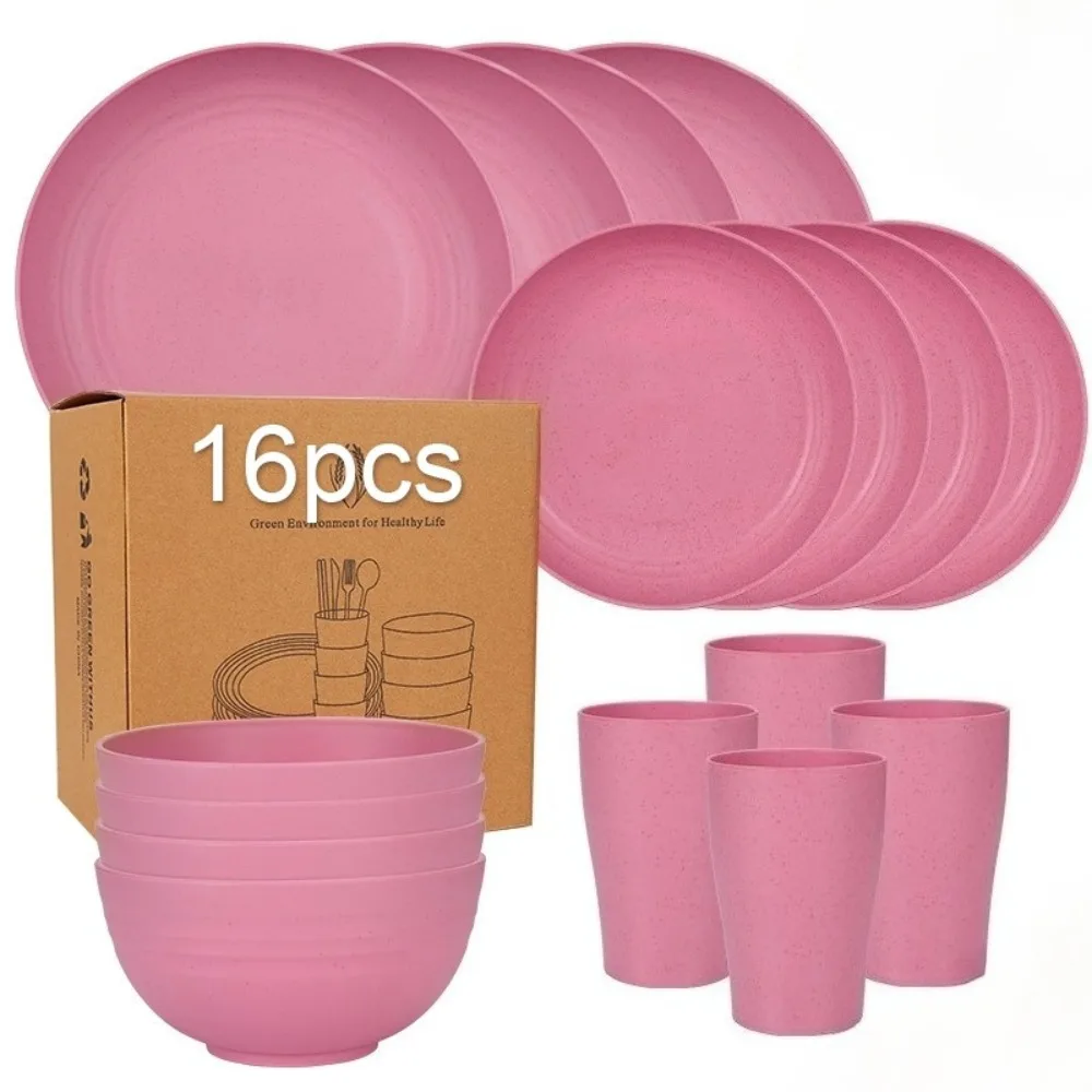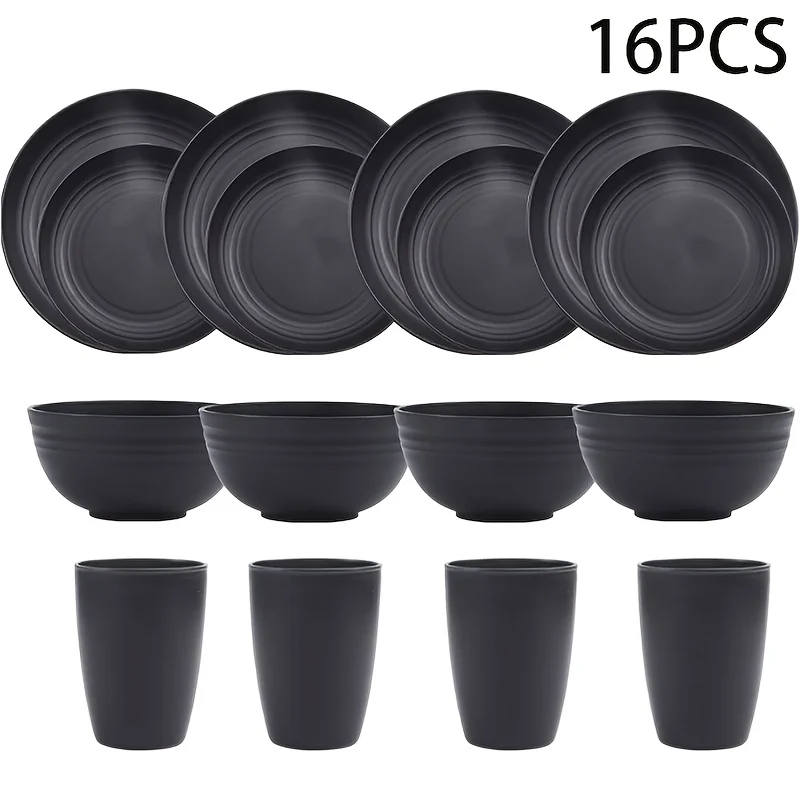 NEW 16-piece Set of Bowls, Cups and Plates, Pure Black Tableware Set, Plastic Dinner Plates and Water Cups Set Gift
