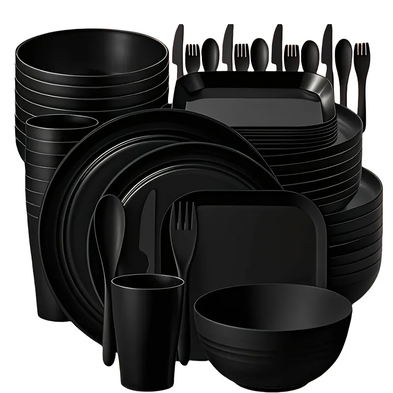 32/64pcs Lightweight PP Plastic Kitchen Set Dishwasher Safe Durable Tableware Modern Round Design for Picnic Party Black